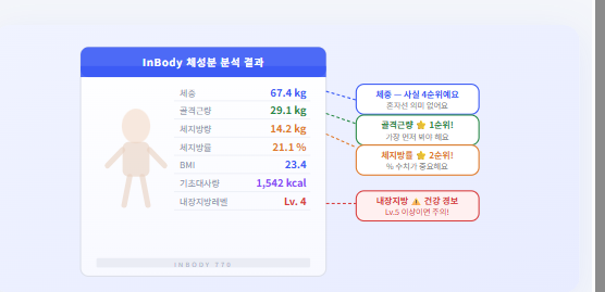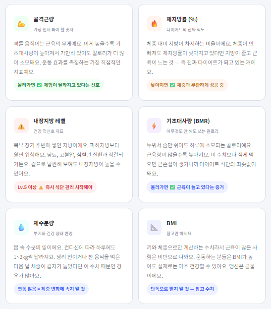 - 근육 키우기가 목표 → 골격근량과 기초대사량 수치가 오르는지 확인하세요