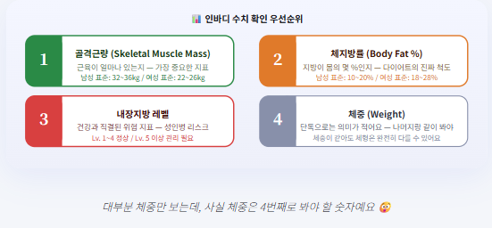 인바디를 어떤 목표로 보느냐에 따라 집중해야 할 수치가 달라요. 내 목표가 뭔지 먼저 정하고, 그에 맞는 수치를 추적하면 훨씬 효율적이에요.